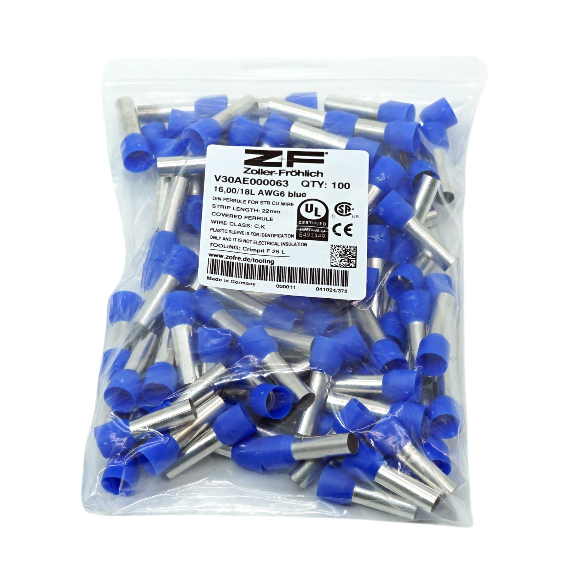Aderendhülsen 16 mm² blau (AWG6) – Zoller & Fröhlich V30AE000063