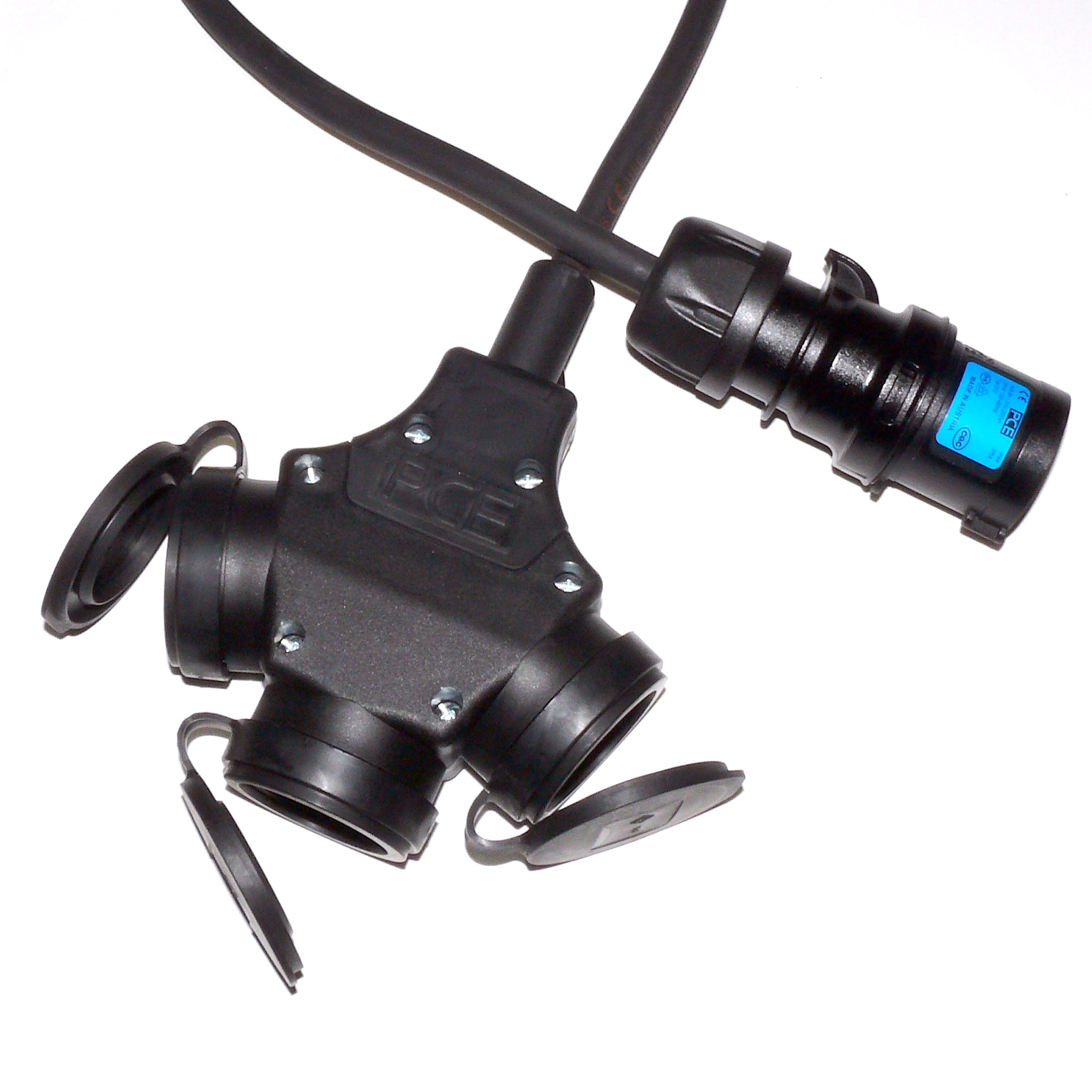 - PCE 3-fach Schuko Vollgummi-Kupplung mit Deckeln am Band, komplett schwarz IP44 (PCE 25311-sxs)