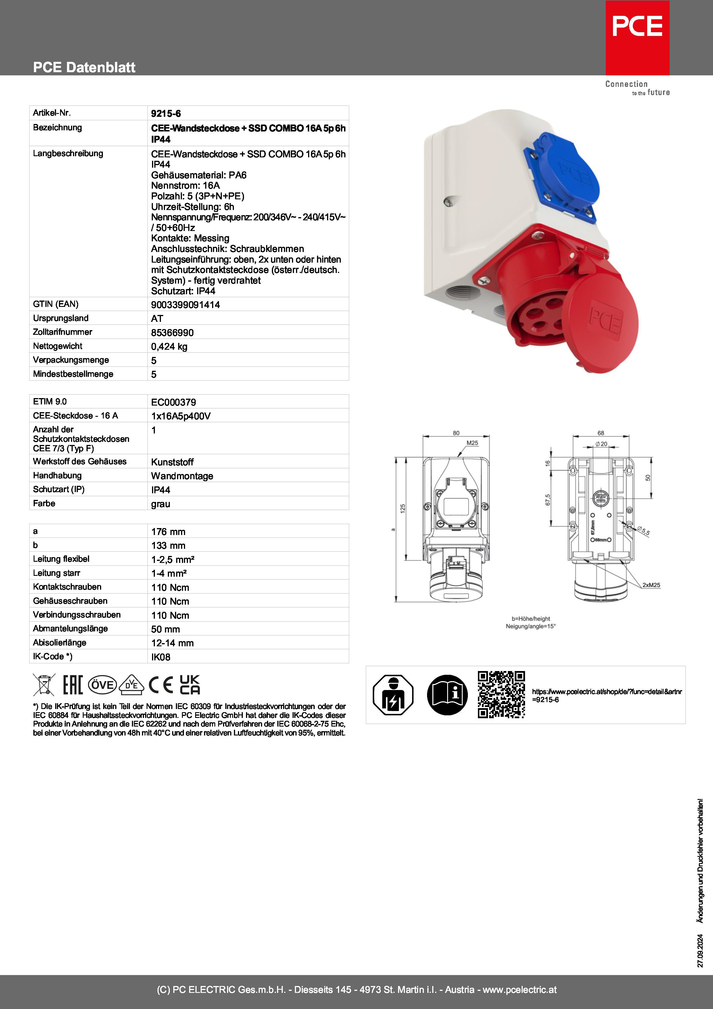 CEE-Wandsteckdose + SSD COMBO 16A 5p 6h IP44 PCE 9215-6