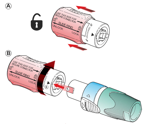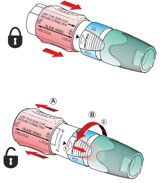Besonders praxisrelevant ist die zweite Verriegelung: Dadurch kann der Adapter dauerhaft sicher an einem speakON® Kabelsteckverbinder befestigt werden. In dieser Konfiguration ändert sich die Anschlussseite zu male.