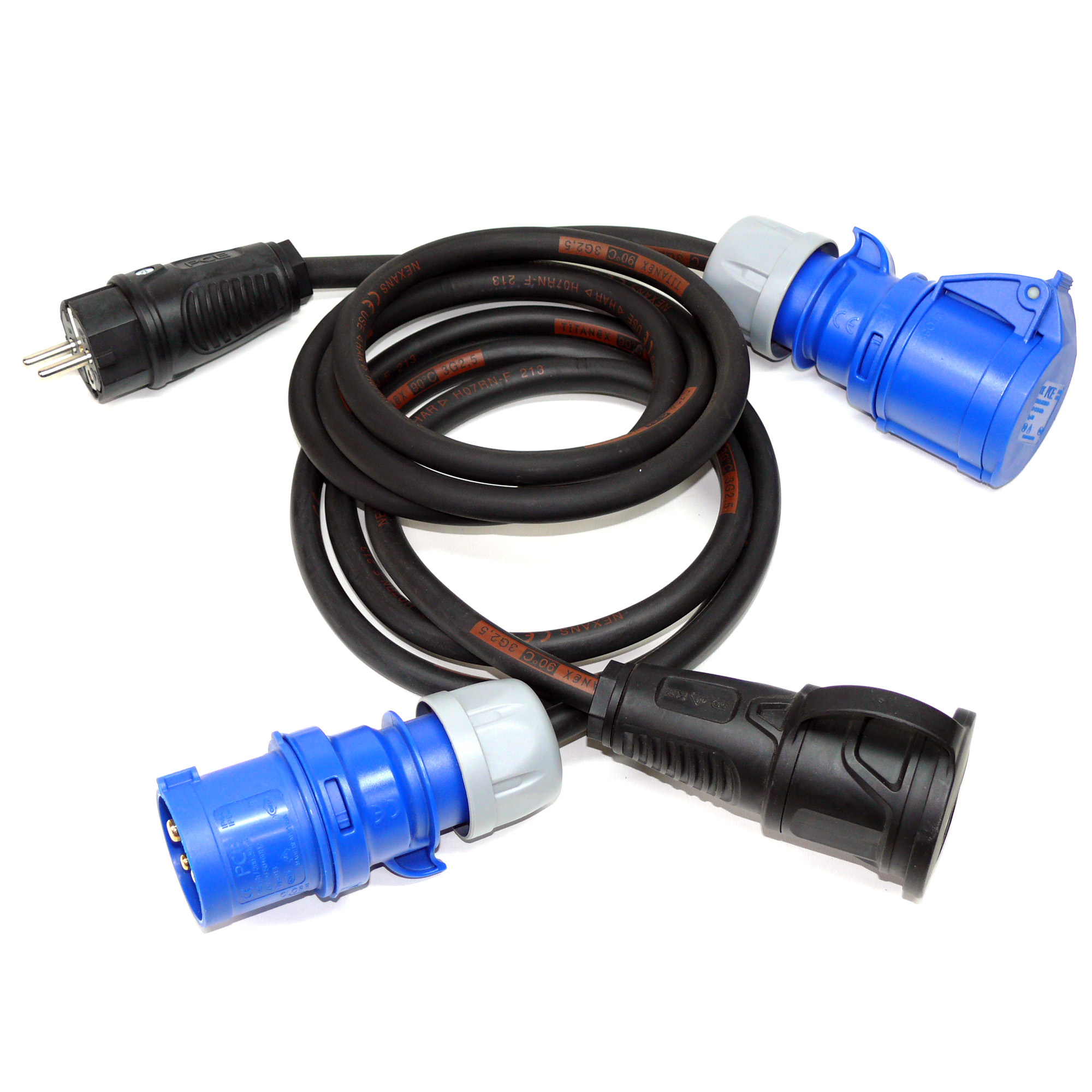 Hochwertiger Adapter von PCE CEE-Stecker blau auf PCE Schuko 230V Kupplung mit TITANEX®-Gummikabel H07RN-F 3x1,5 mm² oder 3x2,5 mm²